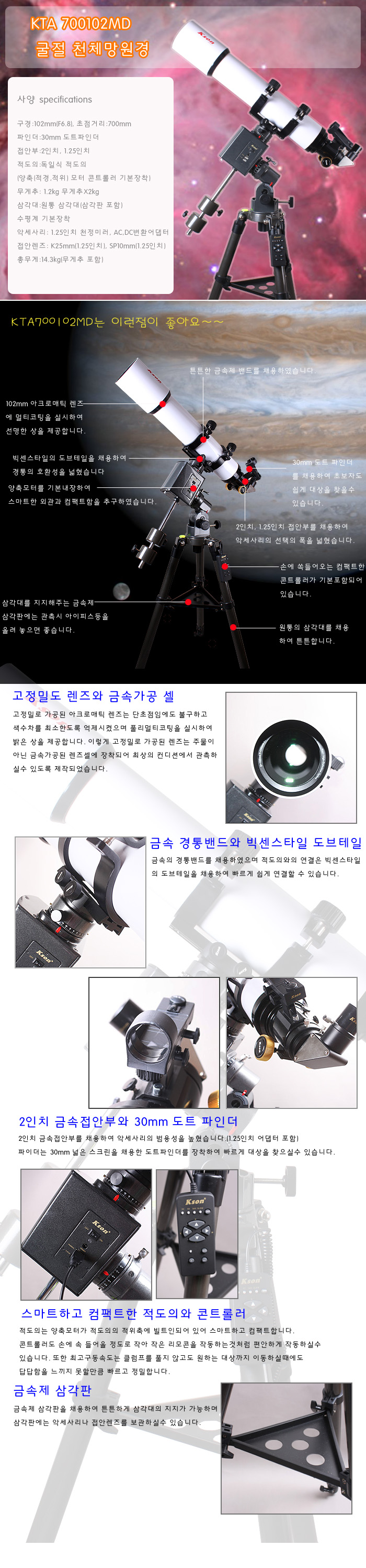 경통은 Kson 구경:102mm, 초점거리:700mm이며 적도의는 Kson Motorised EQ Mount를 사용하였습니다.