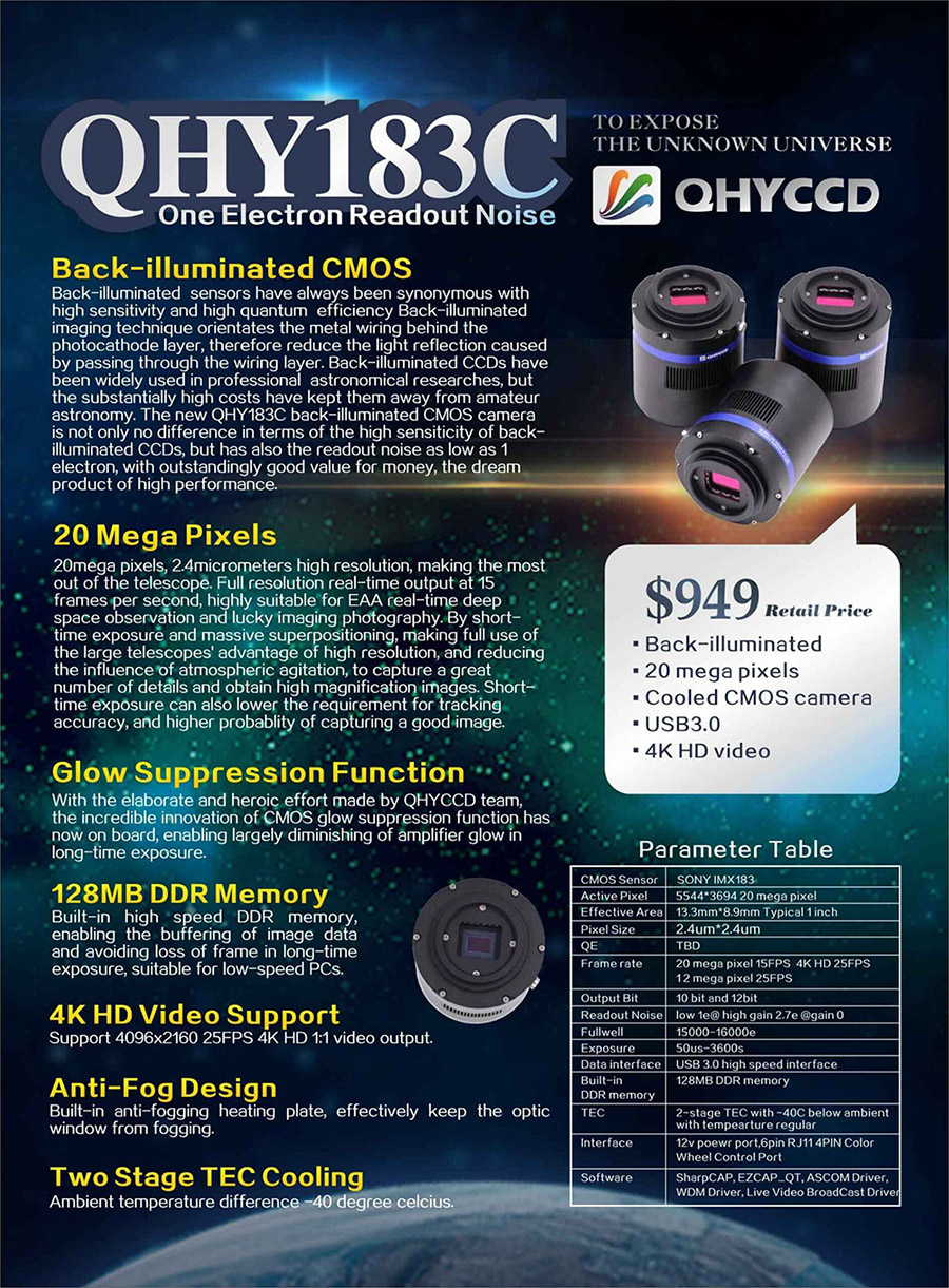 The QHY183M /*C*and*C*/ QHY183C use a 1-inch SONY back-illuminated IMX183 sensor with 20.48 million pixels at 2.4um. This sensor has high sensitivity with 84% QE /*C*and*C*/ a read noise as low as one electron. The full well capacity is 15 - 16,000 electrons. Two-stage cooling yields -40C cooling delta. Because of the small pixels, high QE, good sensor size /*C*and*C*/ the cooled design. The QHY183M/C is suitable for both DSO imaging /*C*and*C*/ planetary imaging. /*C*And*C*/ with the affordable price this camera is idea for both beginner /*C*and*C*/ experienced