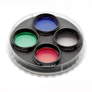 Take your astrophotography to the next level with this set of 1.25" Luminance (IR cutoff), Red, Green, /*C*and*C*/ Blue telescope filters. They're designed for creating high-quality composite color astrophotos with Orion monochrome imaging cameras /*C*or*C*/ similar monochrome cameras. Combining separate images taken through these four filters with a monochrome CCD provides a higher-resolution final image than an image from a comparably sized color CCD. Our LRGB set features dichroic glass filters designed for maximum transmission. The color filters have an IR-blocking coating, /*C*and*C*/ all filters are parfocal to eliminate the need for refocusing /*C*between*C*/ exposure sets. Their anodized aluminum cells thread into the Orion multiple /*C*and*C*/ motorized filter wheels for convenient filter selection. Foam-lined telescope filter case included.